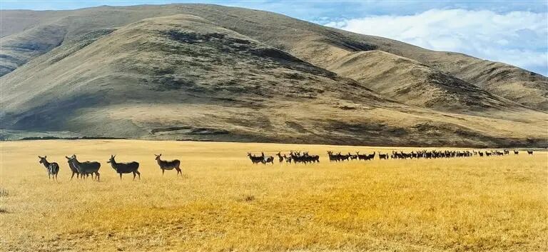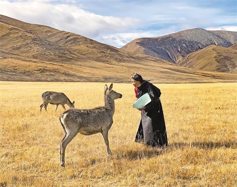 蓝天白云、阳光明媚,金黄色的草原上,藏族阿妈向秋拉姆对着山野呼喊,不一会儿,几十只马鹿从远处跑到阿妈身边,享用着阿妈为它们精心准备的芫根和盐巴。